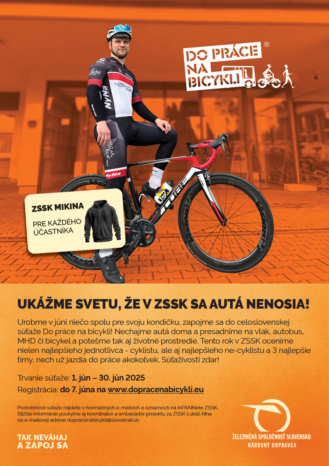 A navyše: Železničná spoločnosť Slovensko, a. s., najväčší osobný železničný dopravca na Slovensku, ktorý prináša ekologické a udržateľné riešenia mobility v našej krajine, venuje do súťaže jednotlivcov dochádzajúcich do práce verejnou dopravou 1× ročný sieťový lístok MAXI KLASIK pre 1. triedu v hodnote 1 060 EUR. Tento lístok oprávňuje držiteľa bezplatne využívať všetky vlaky na Slovensku počas obdobia jedného roka.